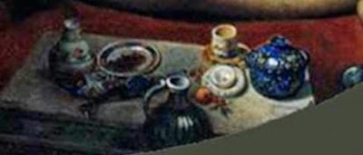 El mundo exótico se resalta por la presencia de detalles del bodegón del primer plano: tetera , jarra de porcelana, taza, pero también collares, esencias ..